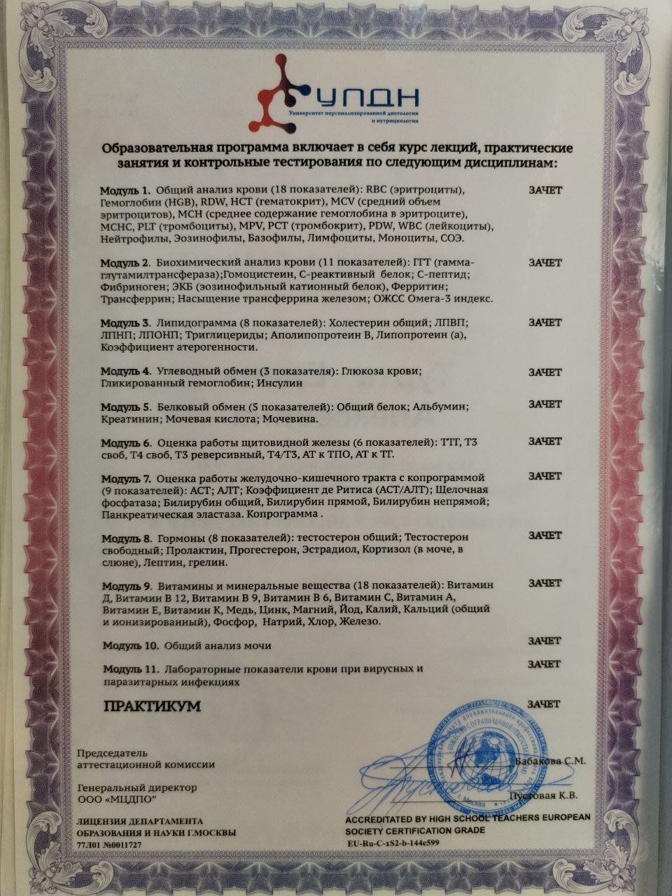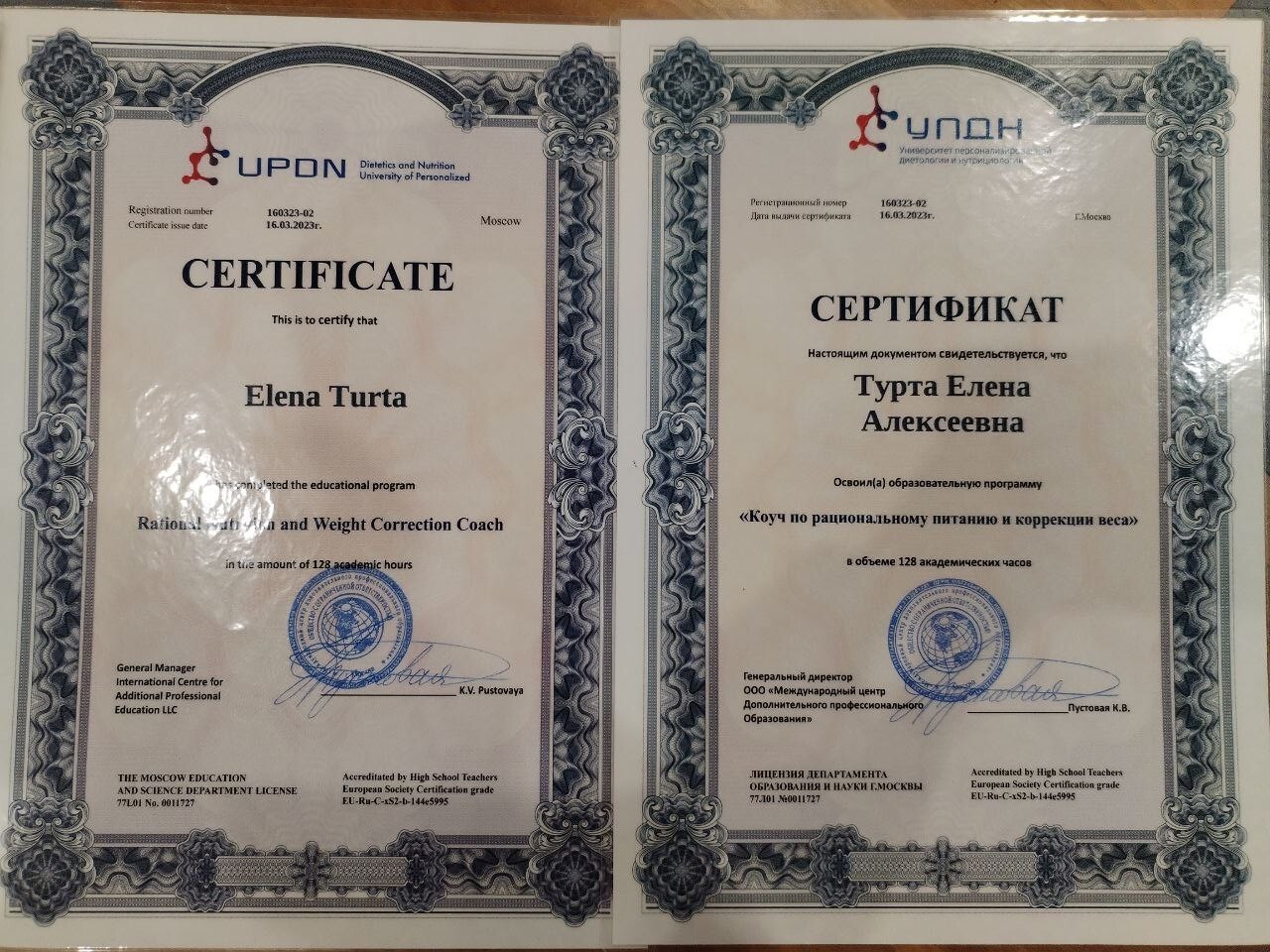 Дипломированный медицинский работник; Лаборант Клинико-Биологической Лаборатории; Косметолог (стаж 35 лет); Психолог; Гирудопластик; Специалист по Дистанционному Видению; Рунолог; Мастер-практик по Буковам Всеясветной Грамоты; Мастер Рейки и Мантра-Рейки, Амадей-Рейки; Целитель спектрами Меркаба и Кундалини; Фасилитатор Access Bars и Access Energetic Facelift; Автор методики «Бесконтактная Косметология» и «Знаковая косметология», Гипнолог-гипнотерапевт; Регрессолог-реинкарнист; Натуропат; Магистр: инженер-строитель СВЕТОВЫХ ТЕЛ; Космоэнергет; Экзорцист; 4 ступень Древних Ведунов; Специалист по Психо Функциональной разблокировке; Автор энергетических лечебных картин, артефактов, амулетов; Член Союза Русских Художников.